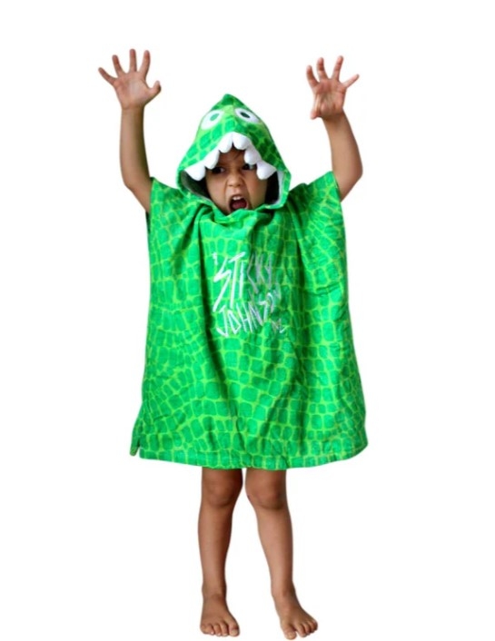The Sticky Johnson Kids Dino Hooded Towel combines premium comfort, functionality, and style for beach days, swimming, and outdoor lounging. Featuring an epic green dinosaur, it keeps your kids looking rad on beach adventures.